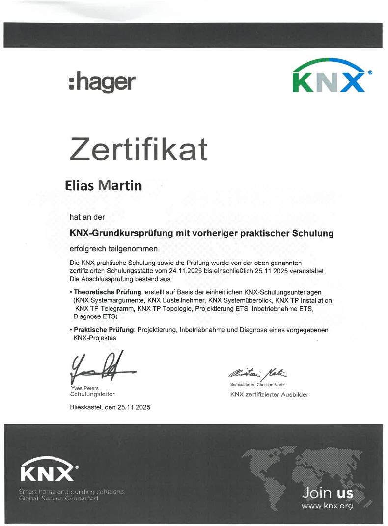 Elias Martin hat gemeinsam mit der Meisterschule bei der Firma Hager in Blieskastel an einer zertifizierten Weiterbildung teilgenommen und dort die KNX-Grundkursprüfung erfolgreich bestanden.